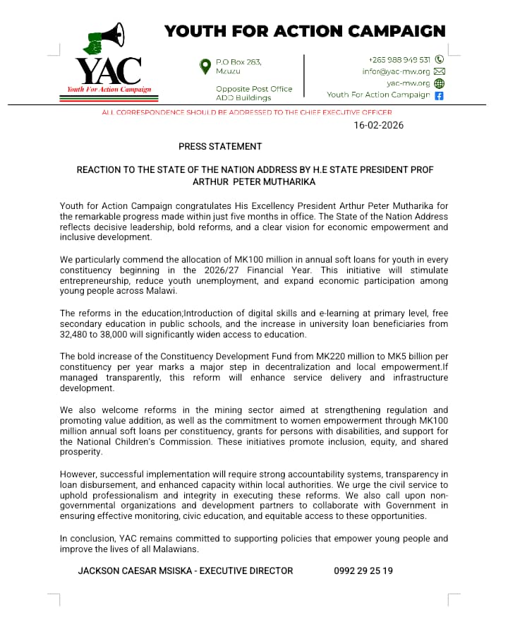 Pothirirapo ndemanga pa nkhaniyi, bungwe la achinyamata la Youth for Action Campaign (YAC), nalo layamikiranso a Mutharika kudzera mu chikalata chomwe chinasainidwa ndi mkulu wa bungweli, a Jackson Caesar Msiska. Iwo apempha mabungwe oyima paokha komaso magulu ena okhuzidwa kuti agwirane manja ndi boma ndicholinga choti masophenyawa  apindulire Amalawi.